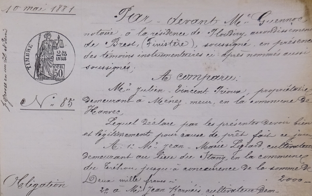Par devant Me Guennoc, notaire à la résidence de Ploudiry, arrondissement de Brest (Finistère), soussigné, en présence des témoins instrumentaires ci-après nommés aussi soussignés, a comparu M. Julien Vincent Prioux, propriétaire, demeurant à Ménez Meur, en la commune de Hanvec.