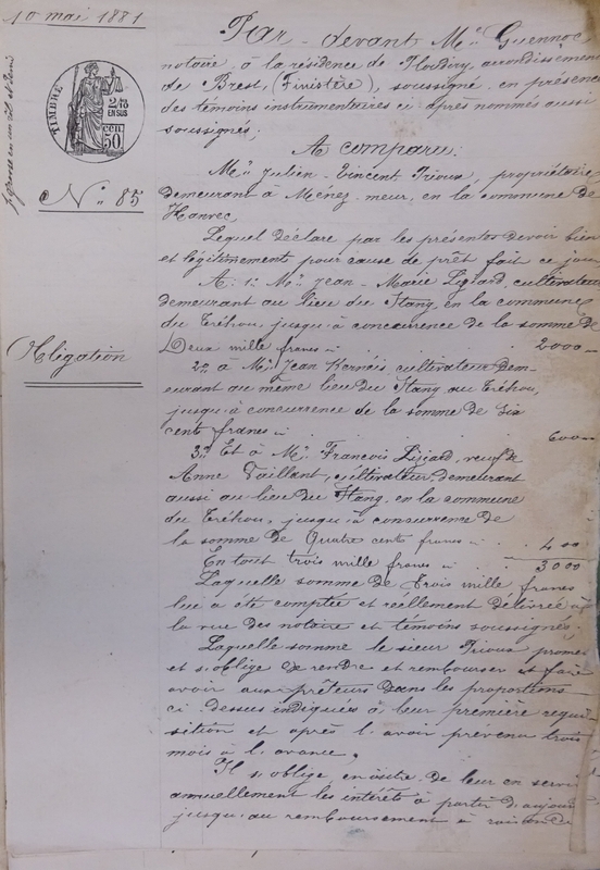 3° M. François Liziard, veuf de Anne Vaillant, cultivateur, demeurant aussi au lieu du Stang, en la commune du Tréhou, jusqu’à concurrence de la somme de 400 F.