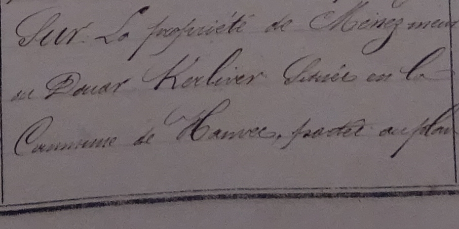 Une pièce de terre en friche sous lande d’un seul tenant nommée Menez Meur ou Douar Kerliver, située sur la commune de Hanvec, canton de Daoulas, arrondissement de Brest, contenant sous fond 149 hectares environ, comprise et désignée sous le numéro 1147 du plan cadastral de la commune de Hanvec, bornée au levant par un rocher nommé Roc’h Plat et des chemins qui s’y joignent jusqu’à la croix du Goff et de l’un de ces chemins nommé Hent ar Quivigerien jusqu’à la croix de Guennec, et du midi vers le couchant d’un chemin menant de Landerneau à Quimper nommé Enchoumeur Izella jusqu’à Roc’h ar Coat et depuis Roc’h ar Coat en continuant vers le levant jusqu’à Roc’h ar Quézec et du nord d’un chemin nommé Hent ar Cont, à prendre depuis Croas ar Guennec vers Le Faou et Daoulas jusqu’à Roc’h Plat.