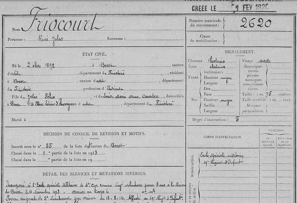 | Friocourt | Louis Marie Léon | 17/12/1888 | 18 rue Traverse | Brest | 18/10/1915 | Landerneau | 22/11/1974 | ? | Saint-Georges-de-Didonne (17) |