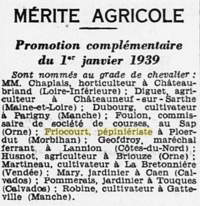 • François Friocourt, père de Jules Félix et grand-père de René Jules, commissaire de la Marine, est aussi promu au grade de chevalier de la Légion d’honneur le 26 avril 1845 puis au grade d’officier le 12 août 1862.
