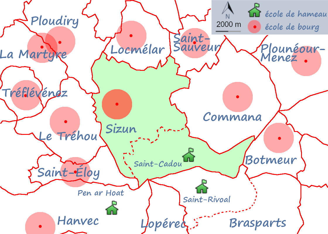 Je viens de visiter le bourg de Saint-Cadou, section et paroisse de Sizun, distant de 7 kilomètres du chef-lieu de la commune. J’y ai cherché en vain un local où l’on peut installer une école. Ce qu’il faut dans ce hameau situé au pied des montagnes d’Arrée, c’est une école mixte tenue par une religieuse. Il y a un bel emplacement près du cimetière. Il faudrait mettre la commune de Sizun en demeure, en lui permettant un large secours sur les fonds départementaux de 25 000 F.