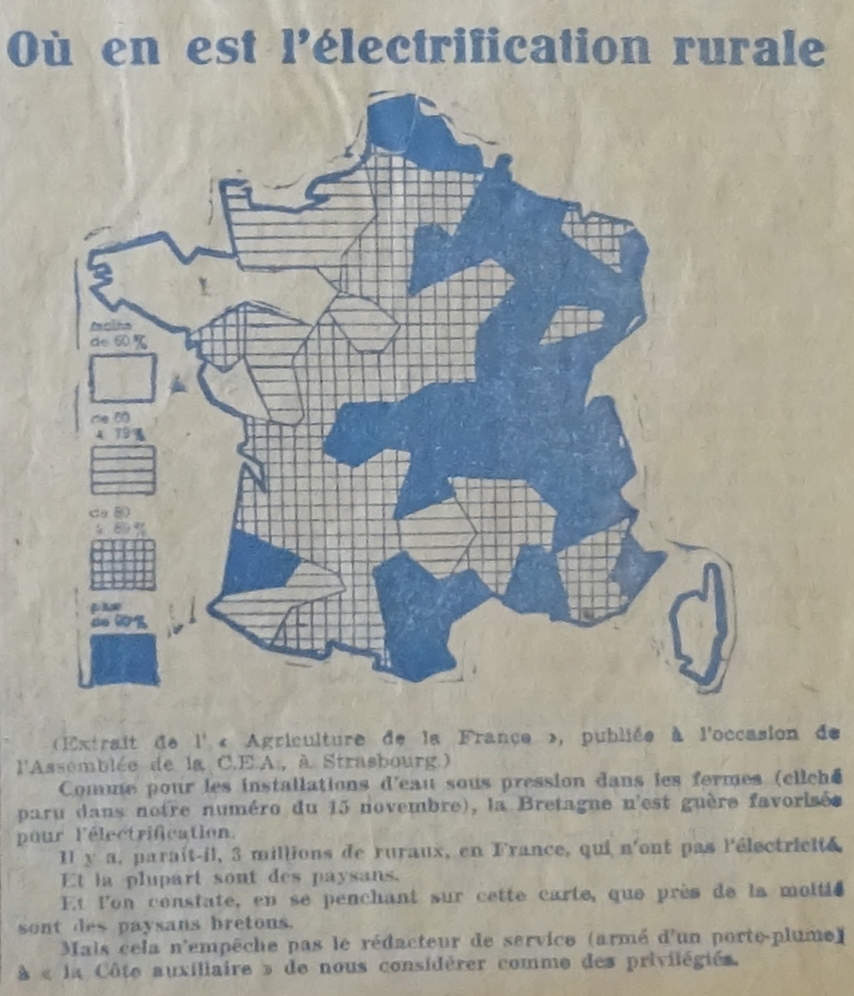 Cette situation est plusieurs fois décrite dans le Paysan Breton. Une carte d’équipement paraît dans le numéro 132 du 1er janvier 1951 qui montre que la Bretagne rurale est la région française la moins équipée : 60 % des ruraux sont en attente.