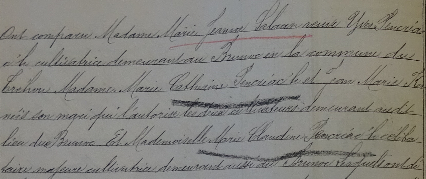 Mlle Marie Claudine Pencréac’h célibataire majeure, cultivatrice demeurant aussi au Brunoc [...]